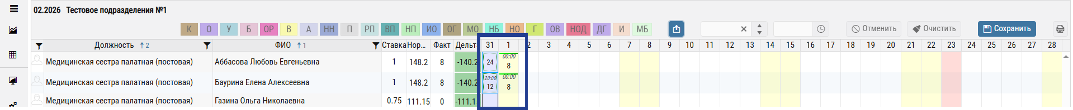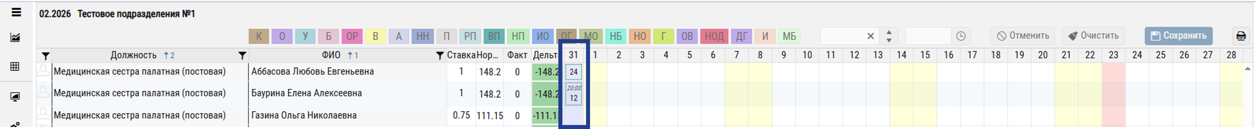Заполнение графика. В столбцах «Числа месяца» для каждого сотрудника по занимаемой ставке указываются интервалы рабочего времени и буквенные коды табельного учёта (обозначающие отклонения от нормального режима).
